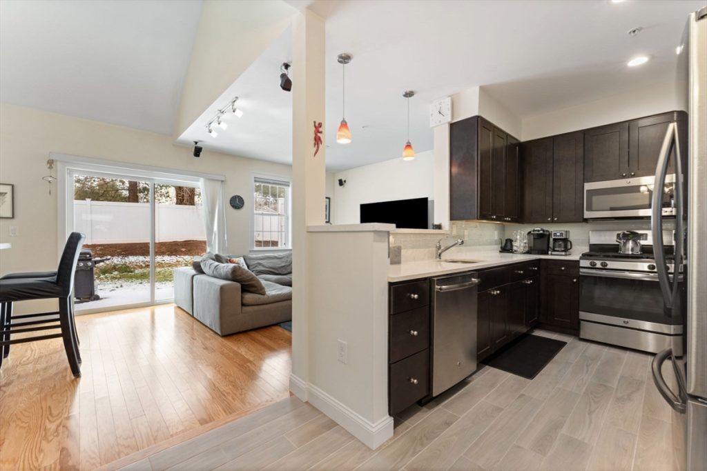 Must see unit in sought after Endicott Woods! First floor open floorplan boasts gourmet kitchen with stainless steel appliances and quartz countertop and breakfast bar, living and dining area with custom lighting, vaulted ceiling. Step out to great outdoor space and private patio. Half bath and one car garage with direct entry complete the first floor. Walk in to the loft living area on the second floor, perfect for home office or den. Primary bedroom has large walk in closet with built ins, additional closet, as well as direct access to the full tiled bathroom. Second bedroom and laundry closet complete the second floor. Tankless water heater, 2-zone high efficiency heating and central A/C. Close to shopping, restaurants and commuter rail. Showings begin at the Open House Saturday, 01/27 and Sunday 01/28 from 12:00-1:30pm.